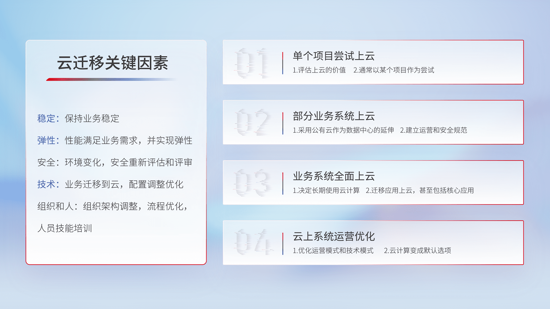 结合实际业务,,,从规划设计、、、云平台选型、、、、云原生改造、、、、数据迁移、、、集成交付,,,,迁移全过程为客户识别最佳上云路径,,,,做好风险识别管理,,,,设计网络架构、、身份权限、、、安全审计合规、、、、操作审计、、、、日志审计、、、、监控告警策略、、、多站点容灾设计等,,对云上基础设施进行整体规划,,提升IT治理水平,,,以满足弹性、、高可用、、、高性能的需求。。。